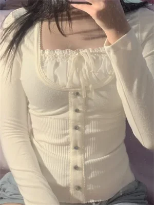 Women Autumn T-shirt Gothic Grunge Y2K Aesthetic Clothes Lace Square Neck Long Sleeve Shirts Harajuku Streetwear