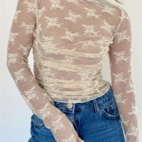 Women Long Sleeve T-shirt Mesh Lace See through Ruched Mock Neck Shirts Summer Sexy Club Beach Tops and Blouses Streetwear