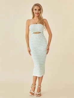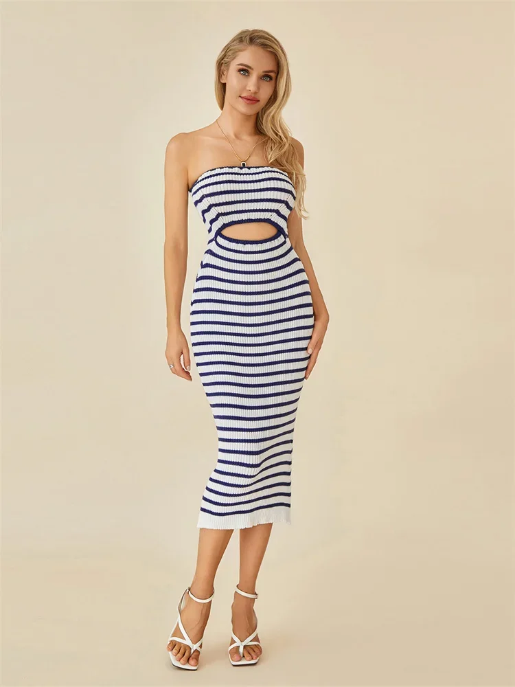 Women Tube Dress, Strapless Backless Hollowed Striped Patchwork Long Dress Clubwear