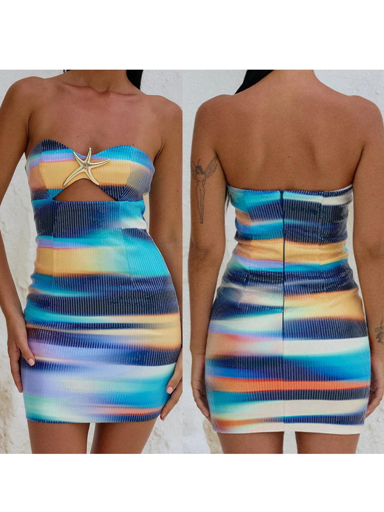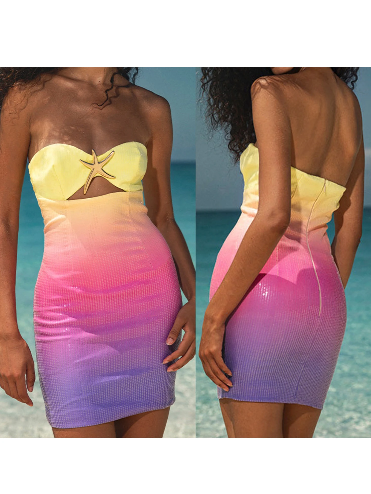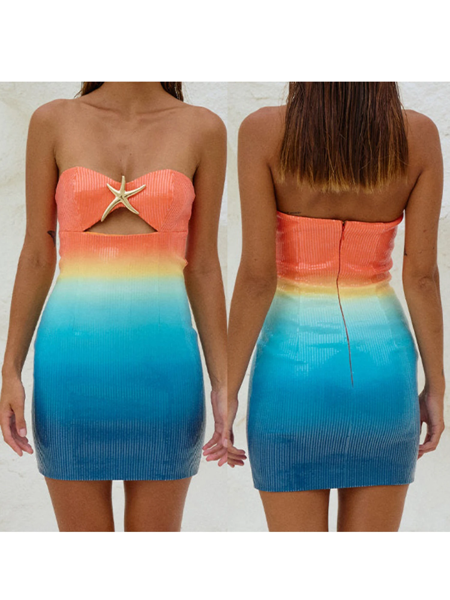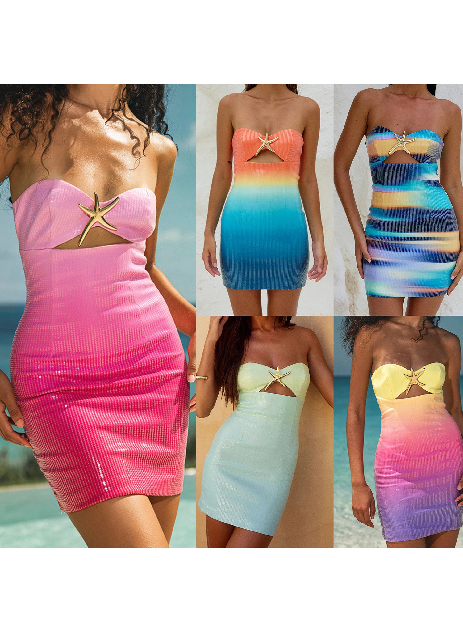 Women Sequin Tube Top Dress Slim Metal Starfish Cut Out Off Shoulder Sleeveless Open Back Mini Bodycon Dress