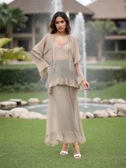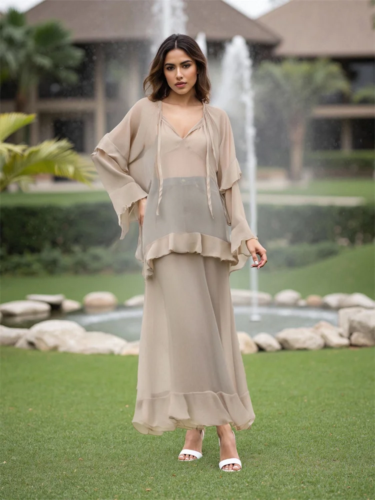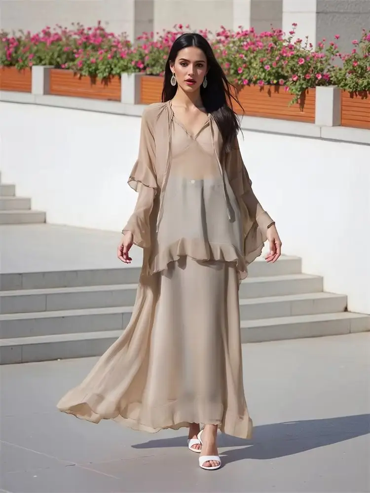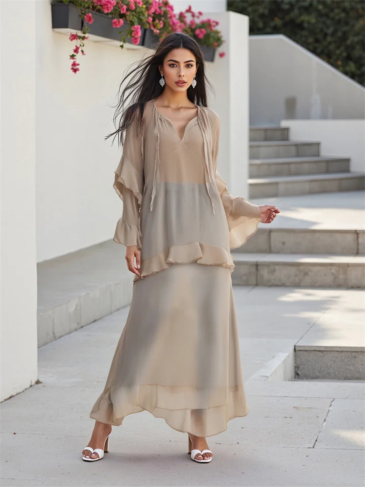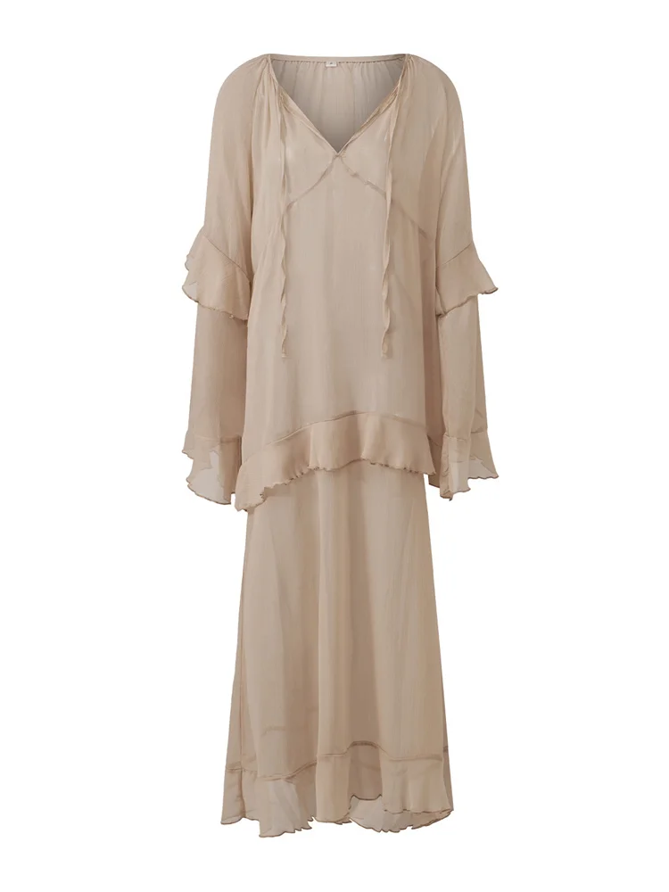 Women’s Spring/Summer Long Dress Loose Fit Stylish Ruffled Trim Solid V Neck Long Sleeve Sheer Dress