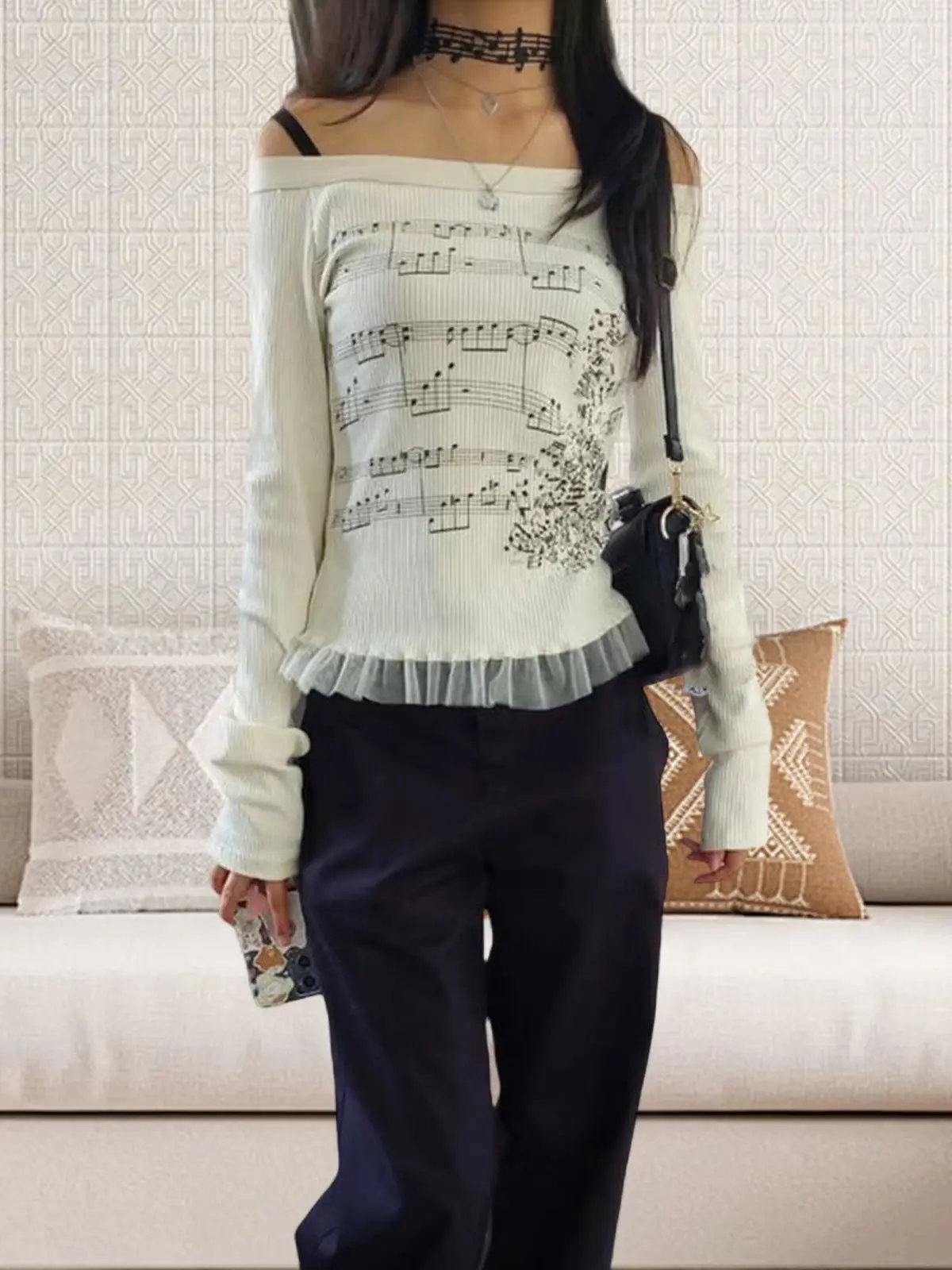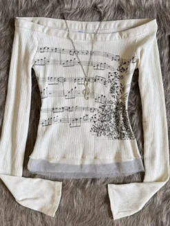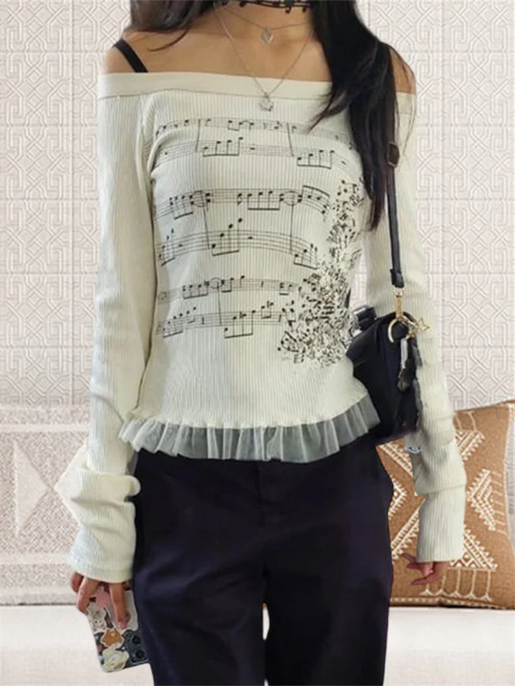 Women’s Off Shoulder Tops Long Sleeve Music Note Print Slim Fitted T-Shirt Ruffle Blouse