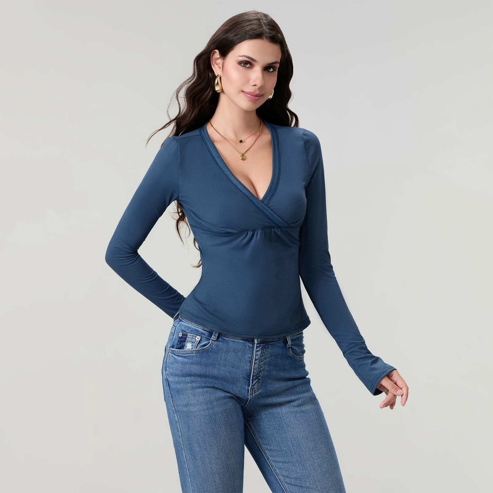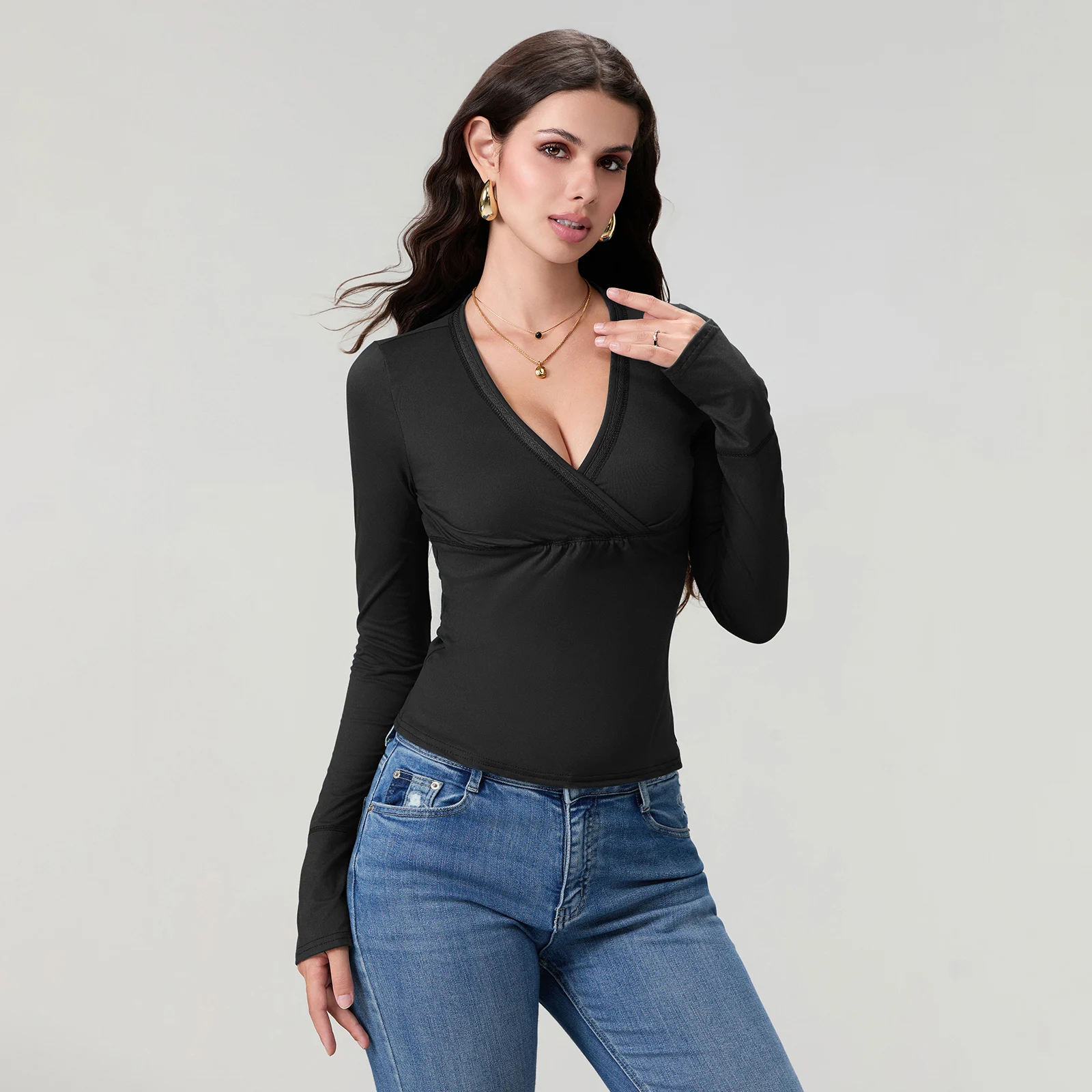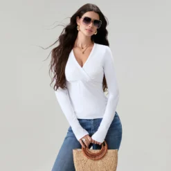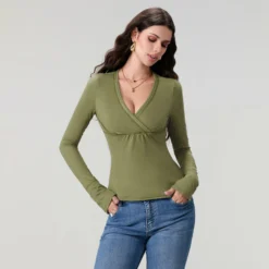 Women’s Spring Slim Fit Tops Solid Color Long Sleeve Wrap V-Neck T-Shirt Streetwear
